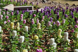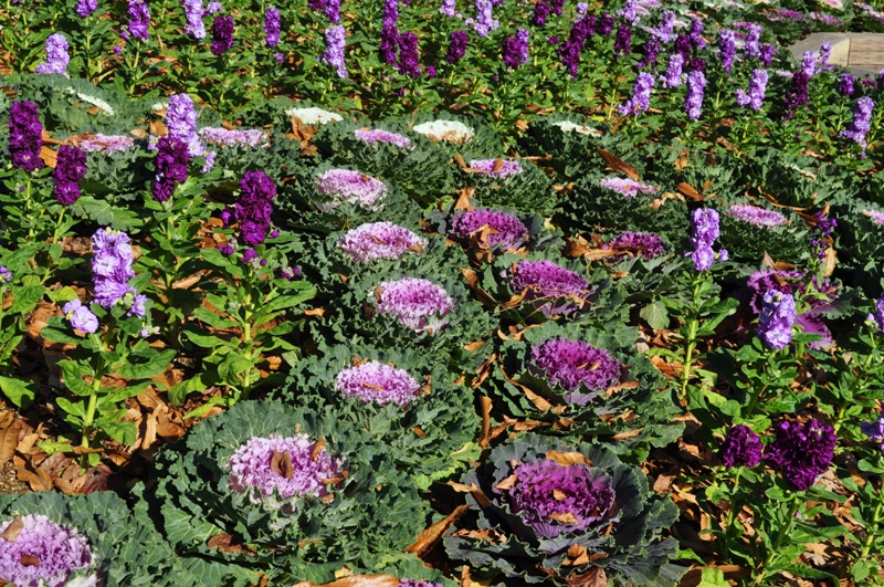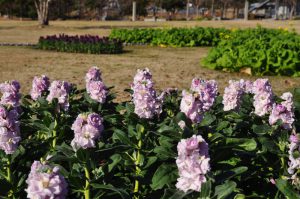 陽だまりの丘では大きなハボタンと紫やピンク、黄や白など淡い色合いがかわいらしいストックのお花がご覧いただけます。
