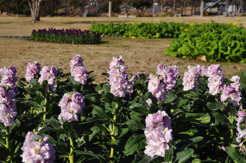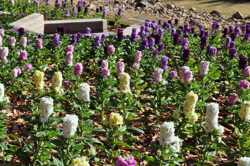 同じエリアにはキンセンカも咲き始めている他、ピンクや紫のストックもご覧いただけます。