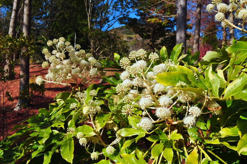 花の谷 手のひらの様に裂けた形の大きな葉とボールみたいな花が面白い ヤツデ(八手)