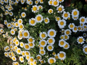 シルバーがかった葉っぱのユリオプスデージーは、大きな株にたくさん咲いて見応えがあります。