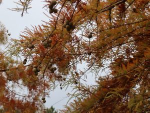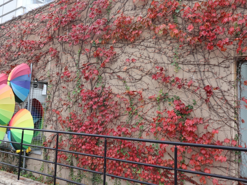 モミジバフウもラクウショウも、緑、黄、赤(オレンジ)と、今なら三色がいっぺんに見られます。どちらも丸っこい実がたくさんぶら下がっているのがかわいらしいです。