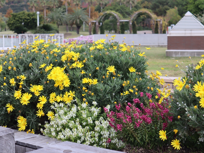 写真一枚目:ツワブキ(場所:花の谷・灘川周辺ほか)、二枚目:空のテラス下のツワブキ(黄色い部分)、三枚目:ユリオプスデージー(※黄色の花。白とピンクの花はアンゲロニア)(場所:海のテラス、花の丘道ほか))、四枚目:ノジギク(場所:花の丘道、移ろいの庭 海側周辺ほか)