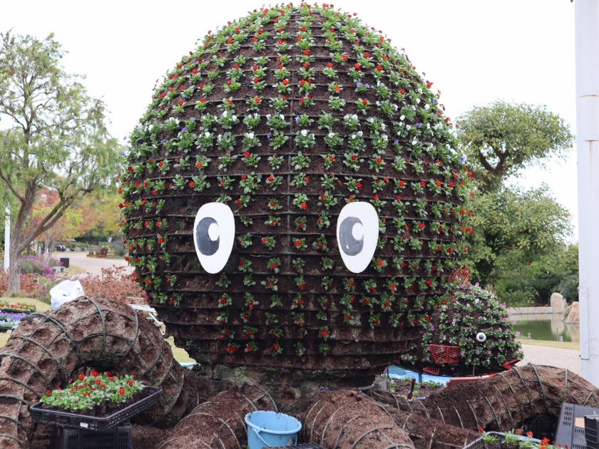 冬に咲くカンザキナノハナが順調に生育中です。また、タコやタイの立体花壇もこれからきれいなお花を楽しめるよう、アキランサスからビオラに植替えました(※写真は途中段階ですが、現在は完成しております)。