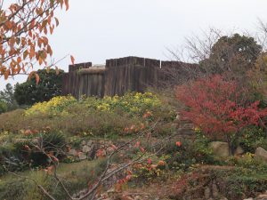 つやのあるまん丸の葉っぱが特徴のツワブキは園内各所でチョコチョコ咲いておりますが、特に灘川の橋の上から空のテラスを見上げた場所が圧巻です。主に初夏にアジサイが咲く場所で秋はツワブキが鑑賞できます。