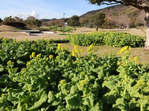 移ろいの庭の花型花壇で咲き始めている寒咲きナノハナは1月以降見ごろとなります。