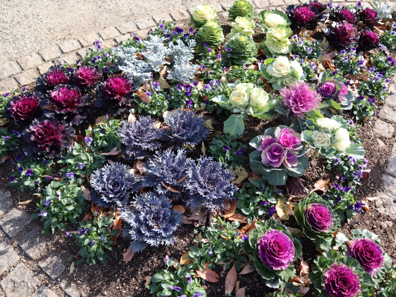 写真一枚目:ハボタン&ビオラ(場所:半円形花壇(花の丘道))、二枚目:サクラ(品種「アーコレード」)(場所:クリスマスローズガーデン(花の丘道))