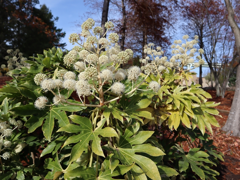 写真一枚目:アツバキミガヨラン(場所:海岸口ゲートそば、花の谷)、二枚目:ヤツデ(場所:水の棚田周辺ほか)