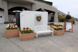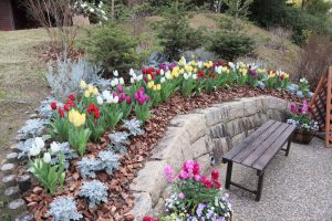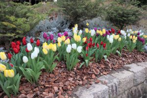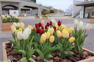 淡路口ゲート前のマス型花壇と連絡口ゲート前の小花壇にて、赤や黄色の「アイスチューリップ」が咲き始めました。「アイスチューリップ」とは球根や鉢植えを冷蔵処理することで促成開花させたチューリップで、約一ヶ月の間チューリップをお楽しみいただけます。