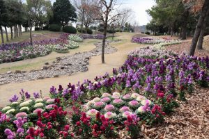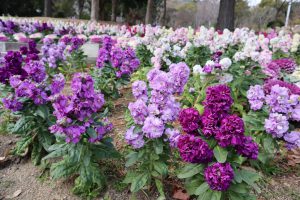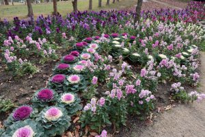 陽だまりの丘では大きなハボタンと紫やピンク、黄や白など淡い色合いがかわいらしいストックのお花がご覧いただけます。