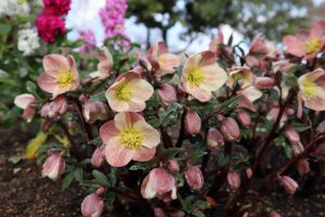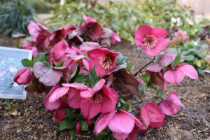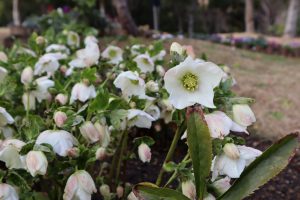 連絡口ゲート横のクリスマスローズガーデンでは、冬に綺麗なお花が楽しめるクリスマスローズがご覧いただけます。1月から4月上旬頃までの期間で、白色のニゲルや高性で緑花のアーグティフォリウス等の原種や、赤やピンクなどの交雑種など色や花型、葉の形などが違う様々な品種が順次開花します。
