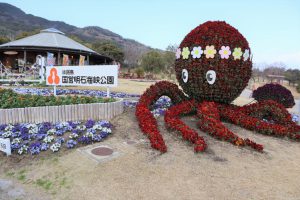 立体花壇「花火鳥&タコトピアリー」 赤や橙、青やピンクとカラフルな ビオラ