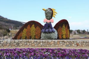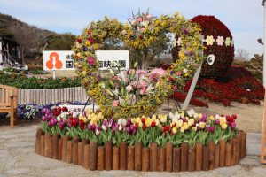 東浦口ゲート入ってすぐのタコトピアリー前に、カーネーションやバラ、パンジーなどのお花と園内で集めた植物でつくったハート型のオブジェが登場しました!