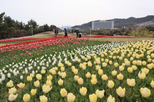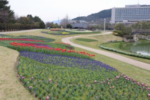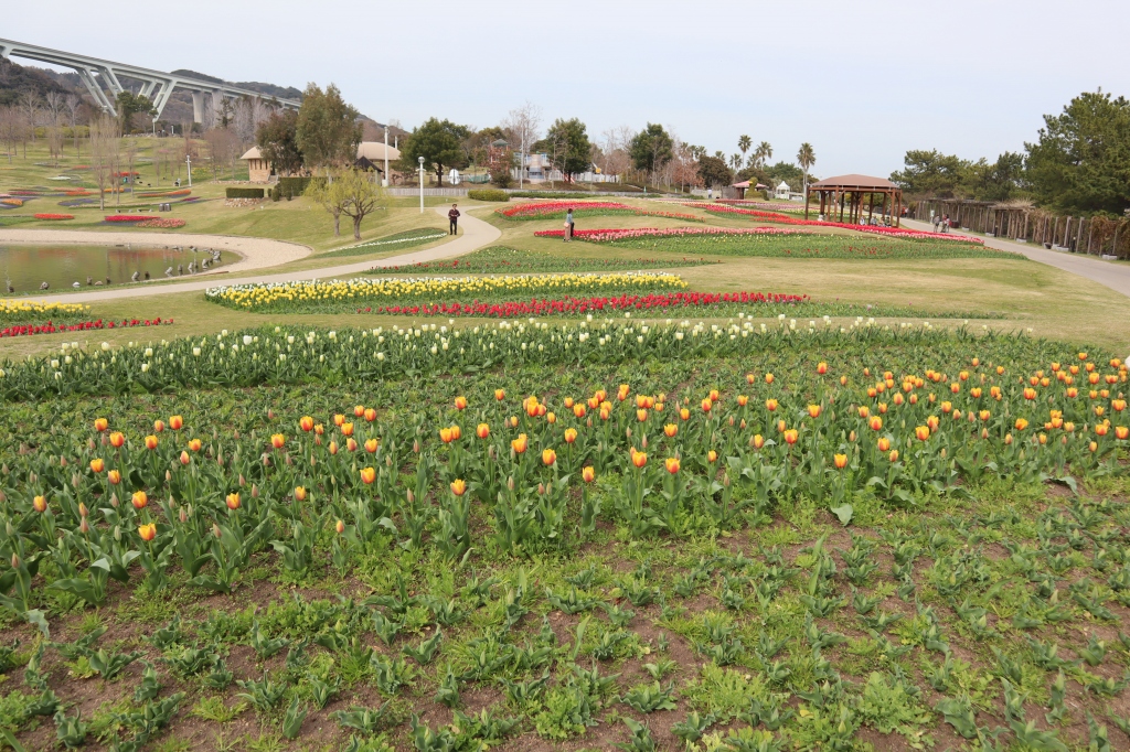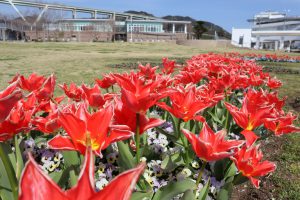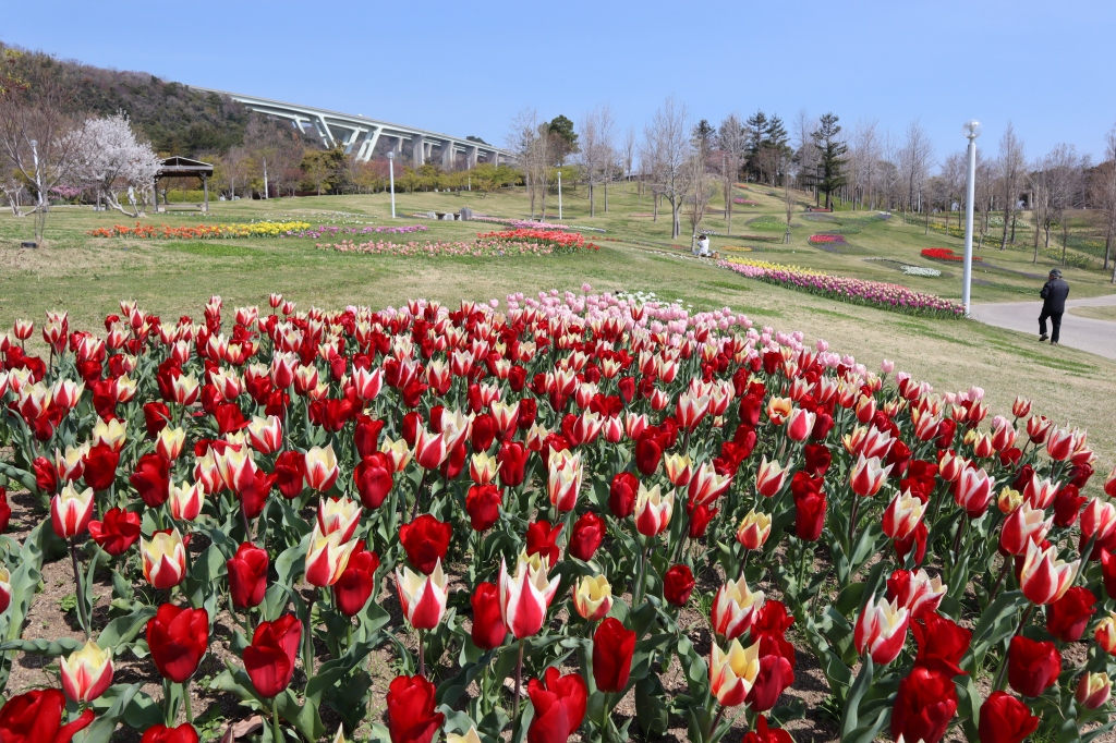 大地の虹北花壇(4分咲き) 子供の森近くのエリア(左写真)で早咲きチューリップ見頃です。