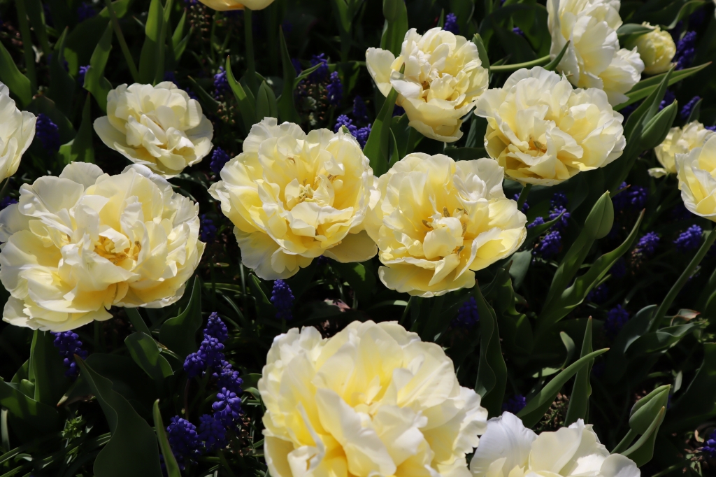 ポプラの丘(3~4分咲き) 早咲きのチューリップとムスカリが見頃です。