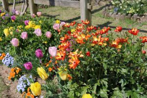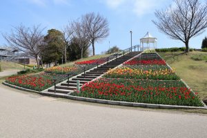 移ろいの庭 階段花壇 赤・橙・黄色が並んだチューリップ花壇