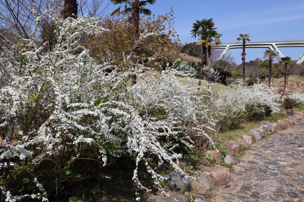 連絡口ゲート周辺、花の谷他 長く伸びた枝に小さな白花がいっぱい ユキヤナギ(雪柳)