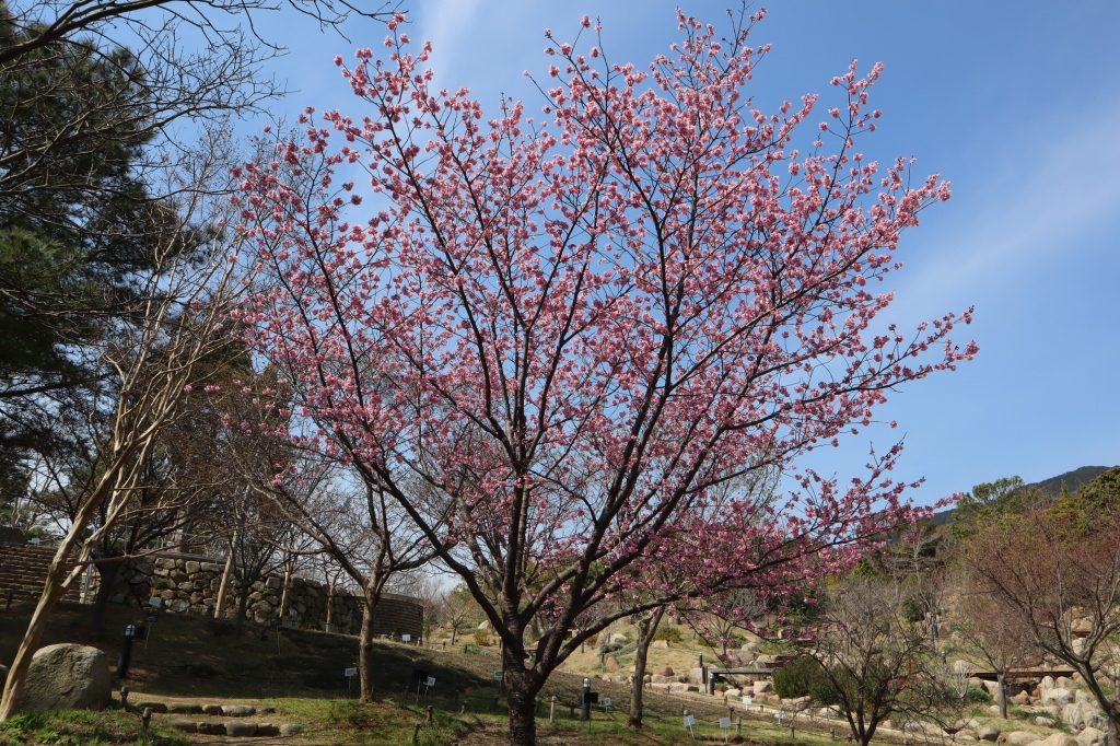 花の谷~花の丘道の園路沿いにて、紅やピンク、白花の早咲き桜がご覧いただけます。
