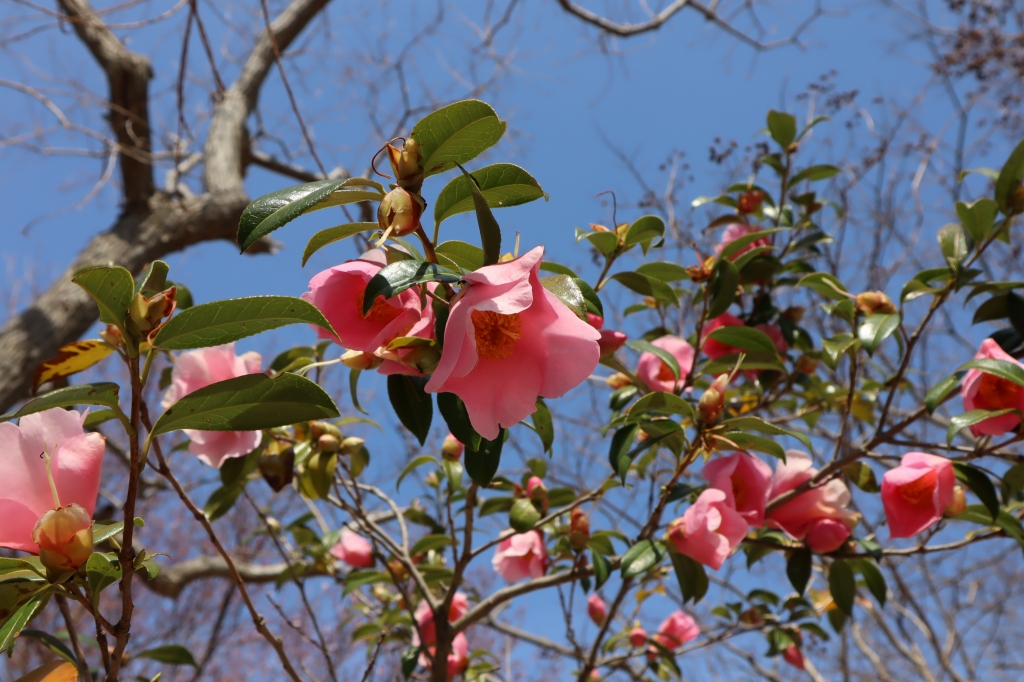 花の谷・花の丘道周辺 白や赤色の ツバキ(椿)