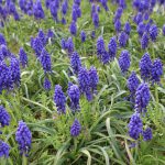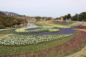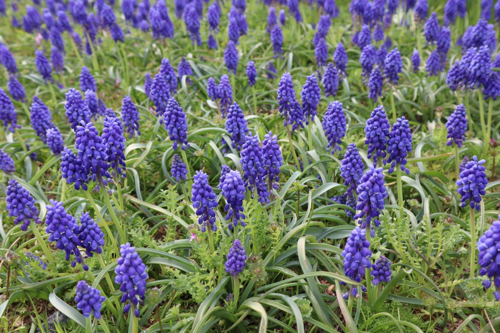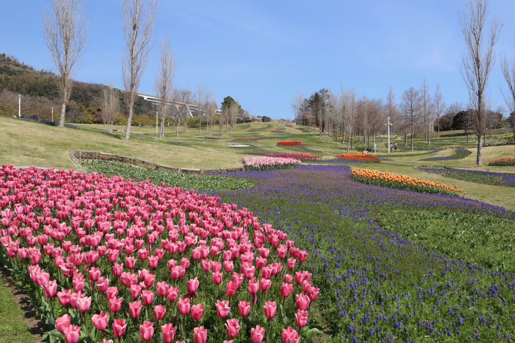 大地の虹南花壇(3~4分咲き) 早咲きのチューリップとムスカリがほぼ見頃です。