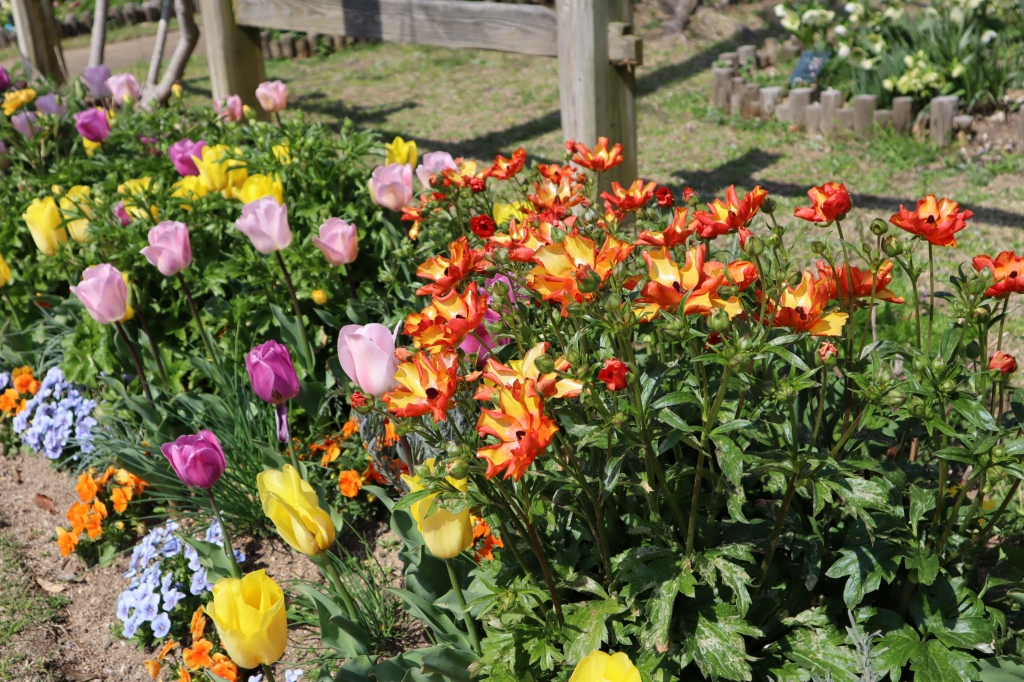 花の丘道 鮮やかな橙色のラナンキュラスとチューリップが一緒に楽しめる!