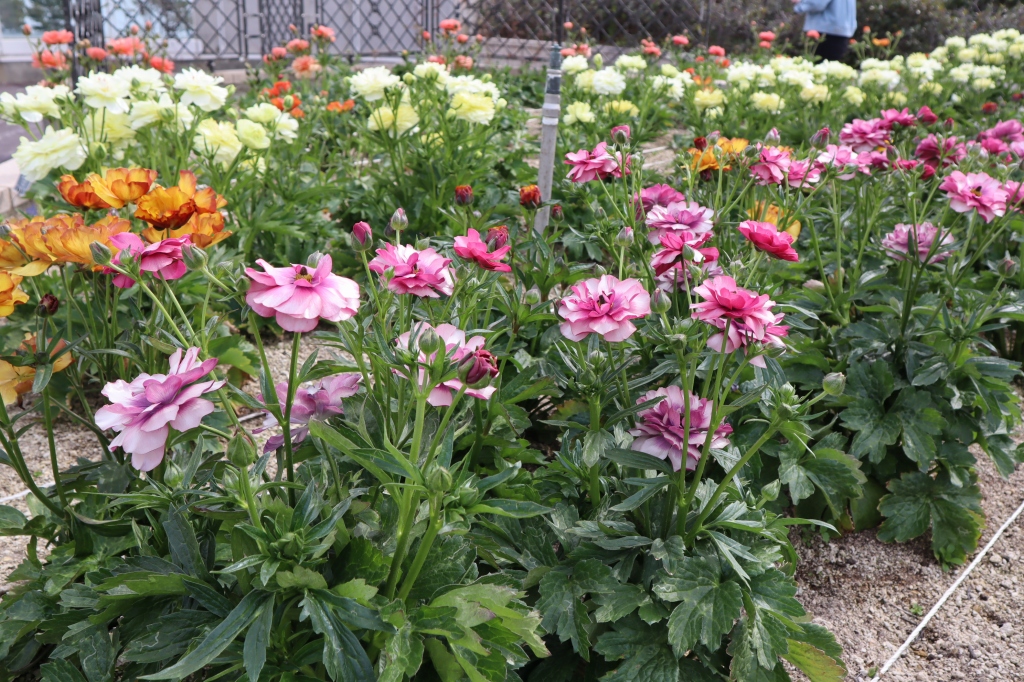 花の丘道や海のテラス上の花壇にてピカピカ光る花びらが特徴のラナンキュラス「ラックスシリーズ」がご覧いただけます。豪華な八重咲きや鮮やかな花色の一重咲きなど、ユニークな花色のお花をお楽しみいただけます。