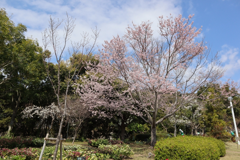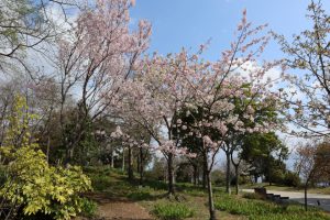 花の谷~花の丘道の園路沿いにて、紅やピンク、白花の早咲き桜がご覧いただけます。
