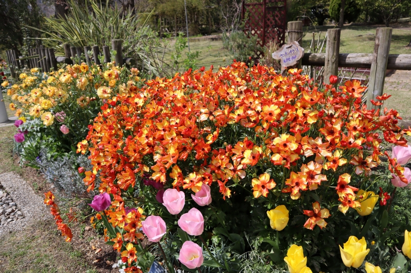 花の丘道 鮮やかな橙色のラナンキュラスとチューリップが一緒に楽しめる!