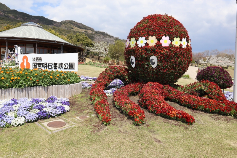 立体花壇「タコトピアリー・花火鳥」 赤や橙、青やピンクとカラフルな ビオラ