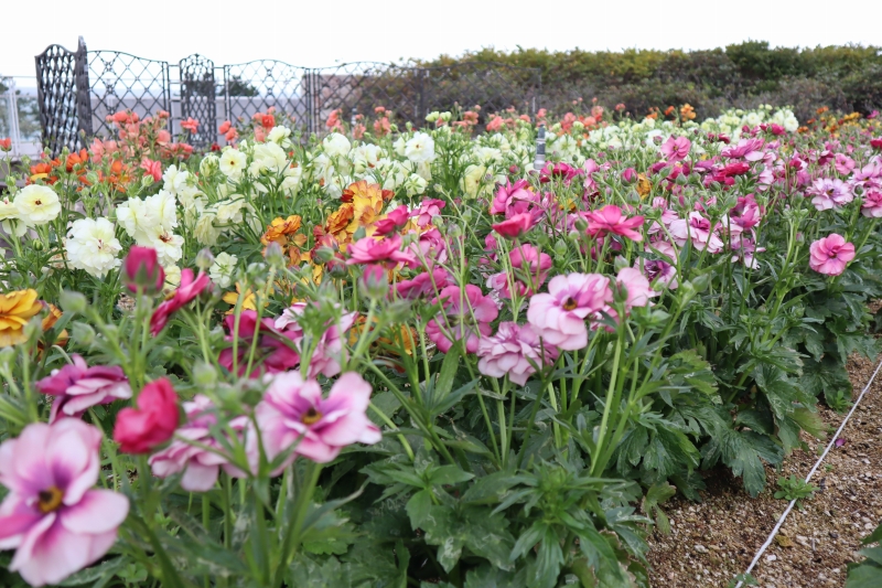 花の丘道や海のテラス上の花壇にてピカピカ光る花びらが特徴のラナンキュラス「ラックスシリーズ」がご覧いただけます。豪華な八重咲きや鮮やかな花色の一重咲きなど、ユニークな花色のお花をお楽しみいただけます。