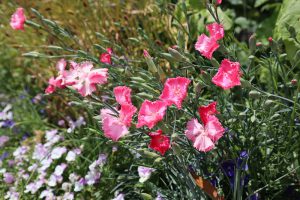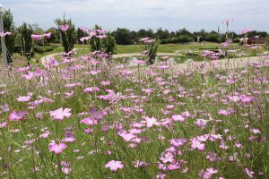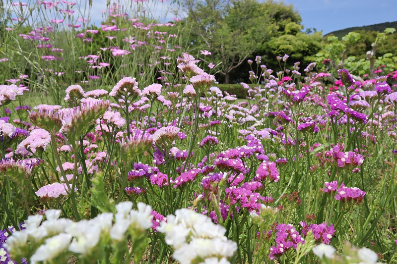 ポプラの丘にて、かわいいピンク色のアグロステンマや、ドライフラワーでもおなじみのスターチス、赤やピンクのダイアンサスなどのお花が見頃となっています。