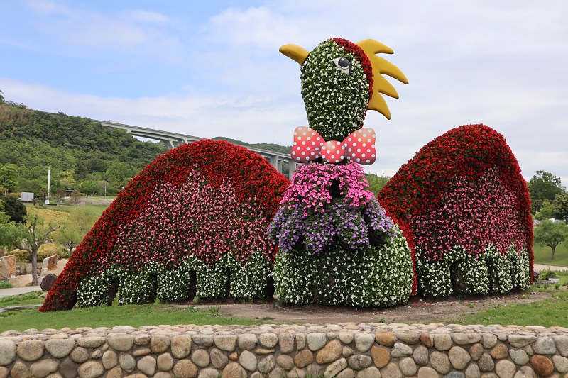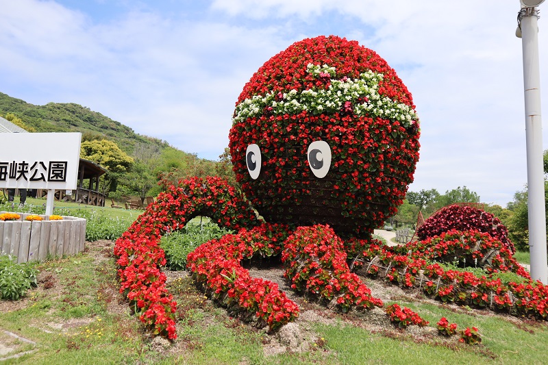 立体花壇「タコトピアリー・花火鳥」 赤・桃・白が鮮やかな ベゴニア