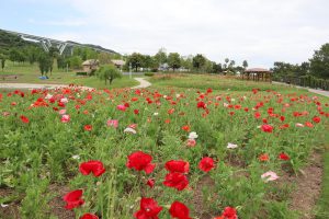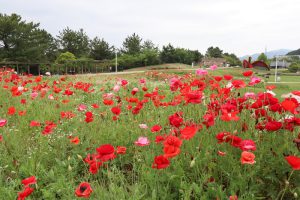 大地の虹北花壇にて見頃のピークは過ぎましたが、薄い紙細工の様なシャーレポピー(雛罌粟)のお花がご覧いただけます。