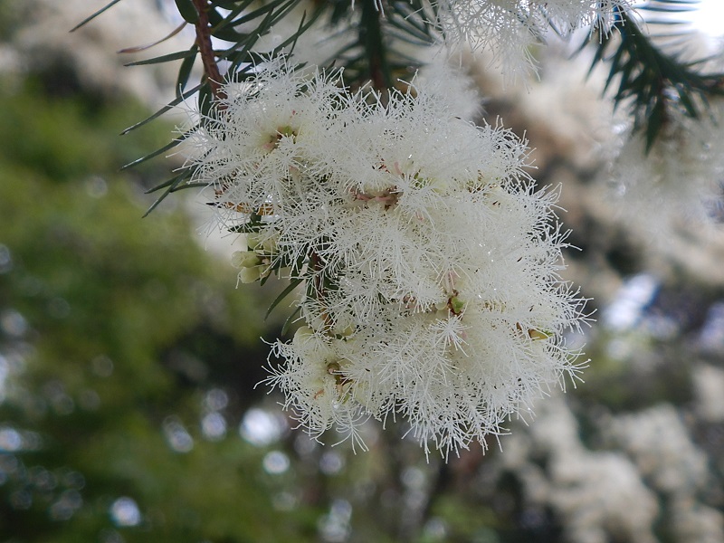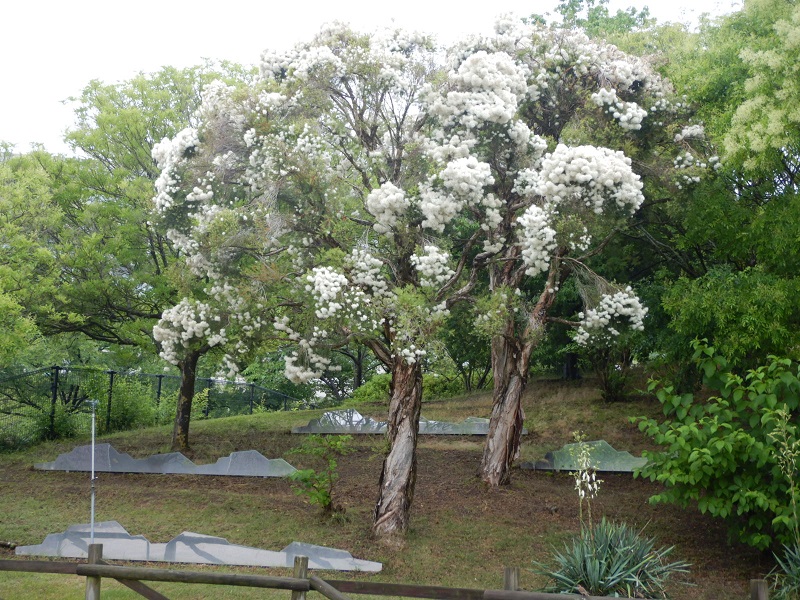 白い綿をまとったような木は、メラレウカ ‘スノーインサマー’です。名前の通り、花は雪の結晶のような繊細さです。近寄って見てみてください!(場所:東浦口ゲートそば、移ろいの庭など)
