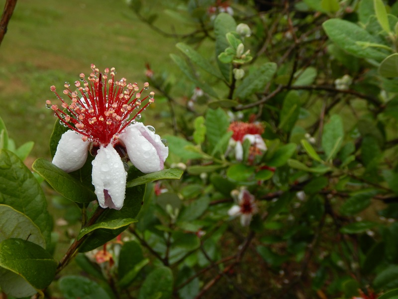 たくさんのおしべと肉厚な花弁が特徴的なフェイジョア(場所:移ろいの庭、夢っこランド周辺ほか)
