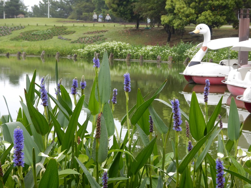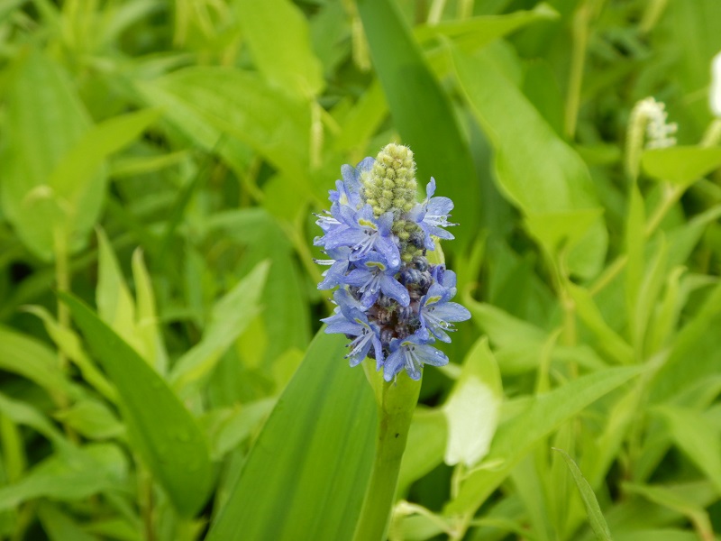 ハンゲショウと一緒に青いすっきりした形のポンテデリアも咲いています。