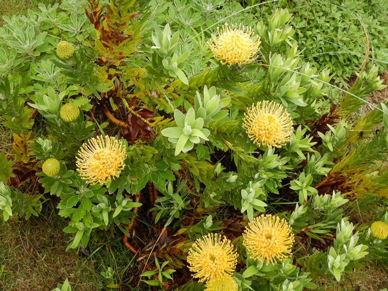 赤い尖った花はサンゴシトウです。(場所:パームガーデンや移ろいの庭など)