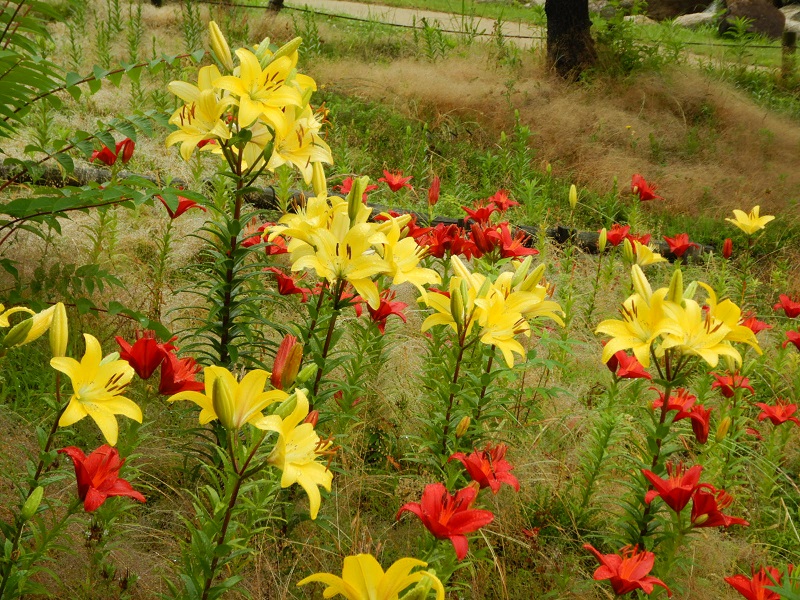 花の谷には様々な品種のユリが咲いています。その片隅に、針刺しのような形の花、リューコスペルマムが咲いていますので探してみてください。