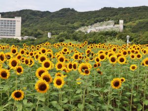 写真左は大地の虹(北)の現況です。花が東側に向きそろっていて、これぞヒマワリ!という感じ。