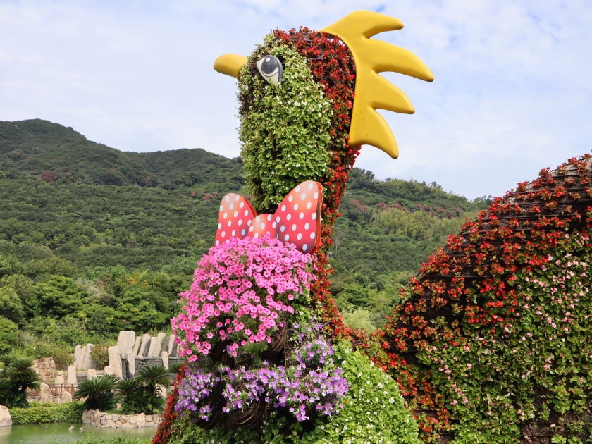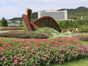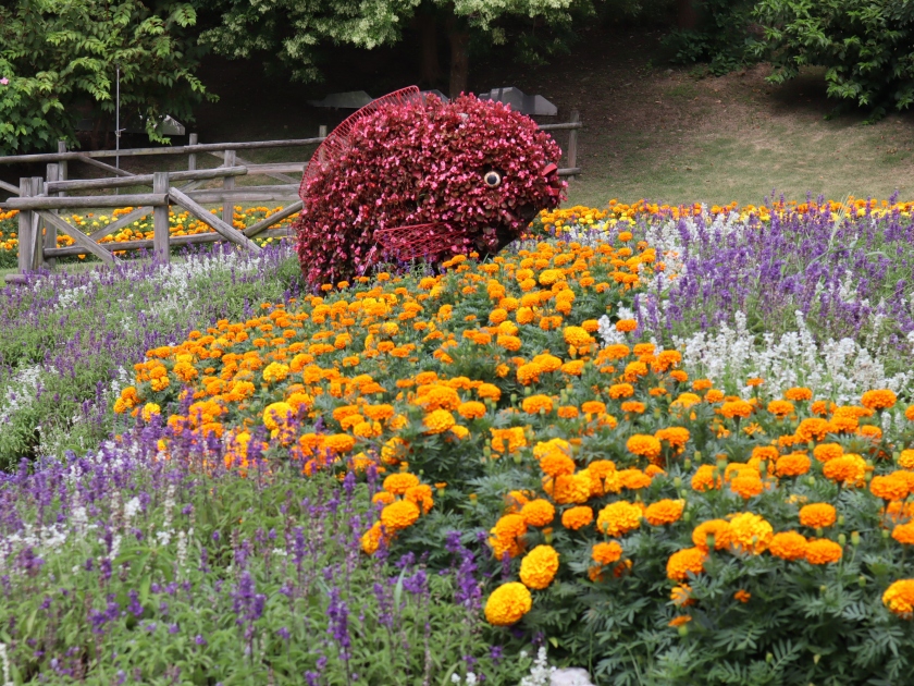 とっても写真映えのする花火鳥。記念写真に大人気の場所ですが、今年はベゴニアの調子が悪く、よく見ると地肌が見えています(涙)。9月以降の秋冬バージョンの植替えまで、もう少々この状態で。。。