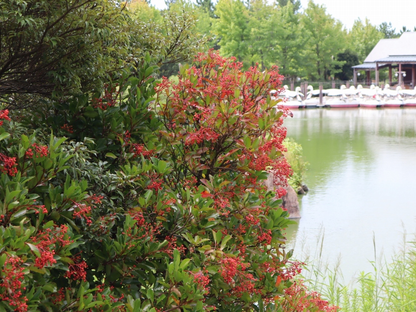 赤の実と黄色の実。中海の周りが夏色です。観葉植物で室内栽培が人気のホンコンカポックが、屋外でノビノビ育ってます。
