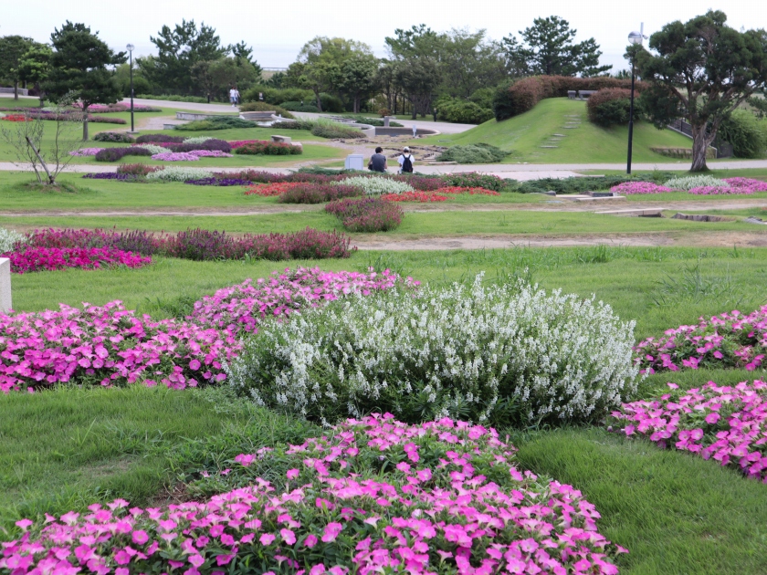 写真左:東浦口ゲート前のお出迎え花壇(アフリカンマリーゴールド、ベゴニア、サルビア)