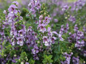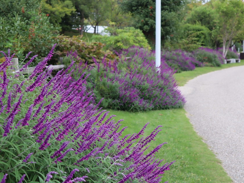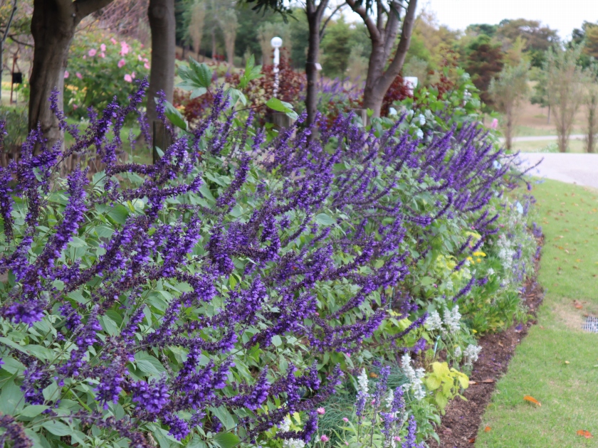 サルビア・レウカンサはビロードのような手触りの紫色の花。サルビア「インディゴスパイアー」はインディゴのような紺色。サルビア・アズレアは透明感のある水色。どれも青系でスッキリ。