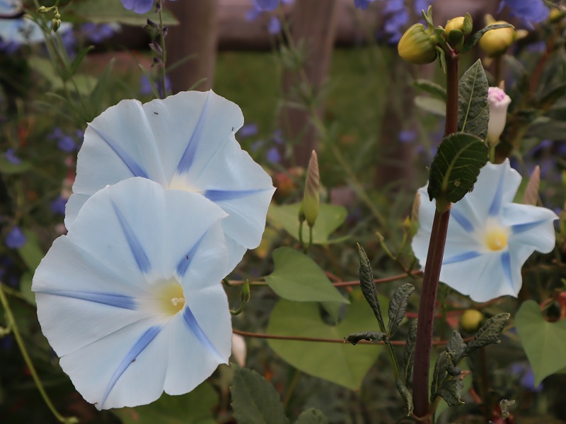 西洋アサガオは秋からが本番です。花の丘道のフェンス沿いで、サルビアにからんでいます。
