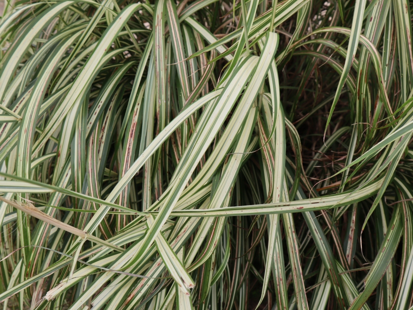 写真一・二枚目:ススキ類、三・四枚目:葉っぱのアップ(タカノハススキ、シマススキ)(場所:移ろいの庭、花の谷ほか)