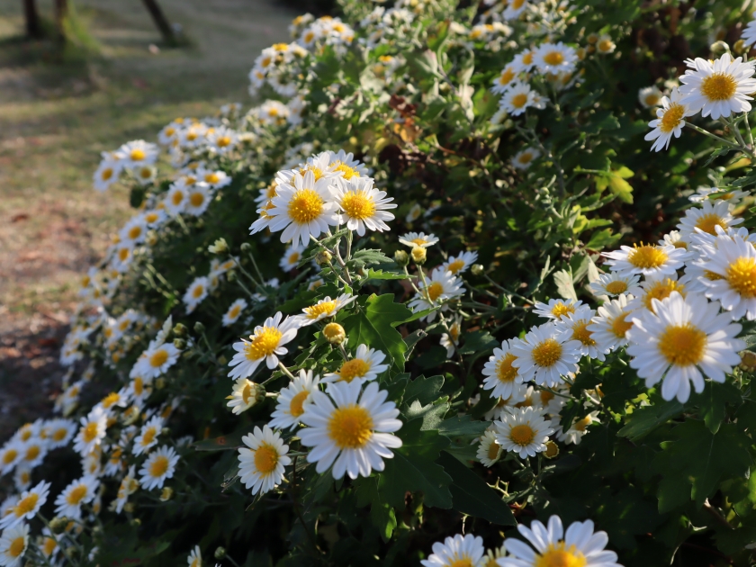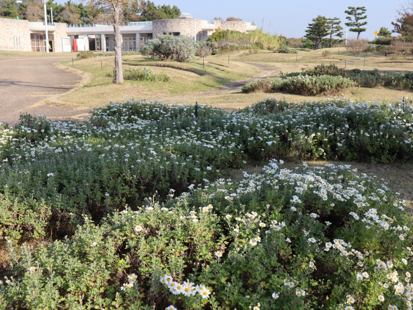 兵庫県の花、ノジギク。海岸口ゲートそばの広範囲で咲き始めました。小規模ですが、花の丘道のノジギクは満開状態です。