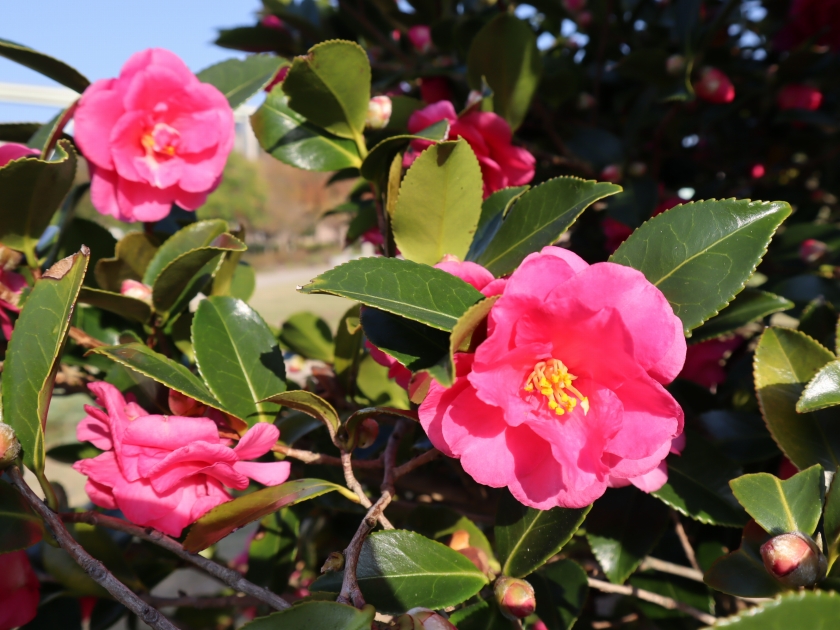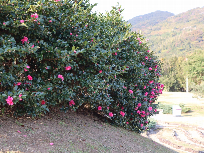 写真一・二枚目:カンツバキ(場所:移ろいの庭、東浦口ゲートそばほか)
