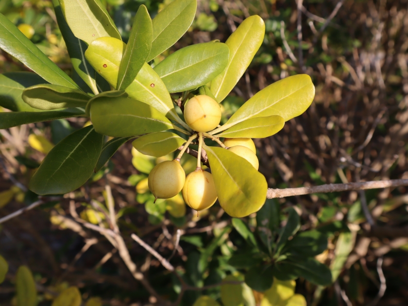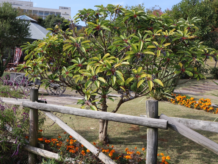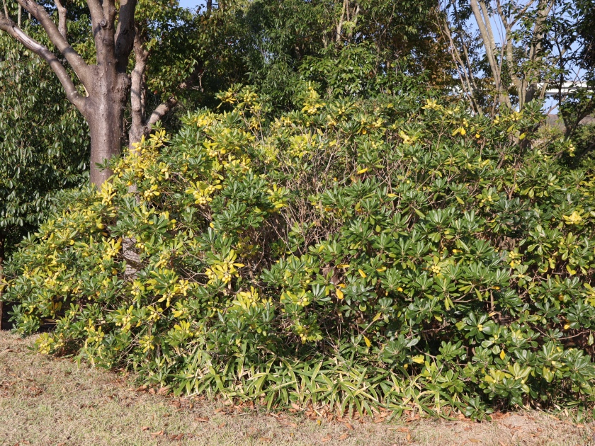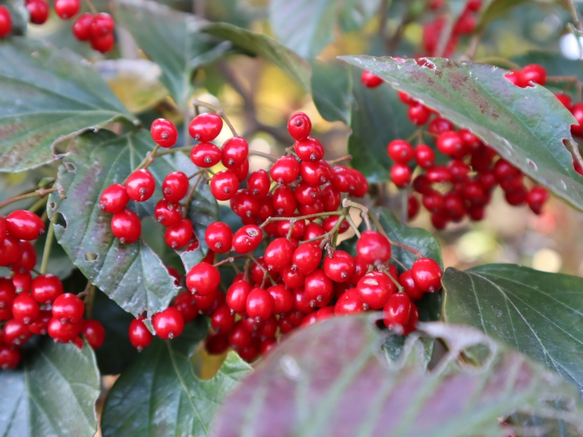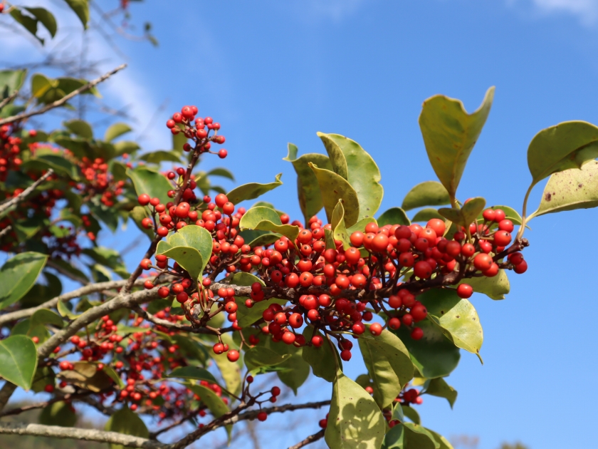 ツヤッツヤの赤い実がすずなりのハクサンボク、大きな木にオリーブみたいな実が下がったセンダン、プチプチッとイクラに似た実のクロガネモチ、ヒメユズリハは赤い葉柄と黒い実の組み合わせが目をひきます。トベラは現在はツルッとした黄色の実ですが、もう少しすると実がはじけて、中からネットリしたオレンジの実が現れます。