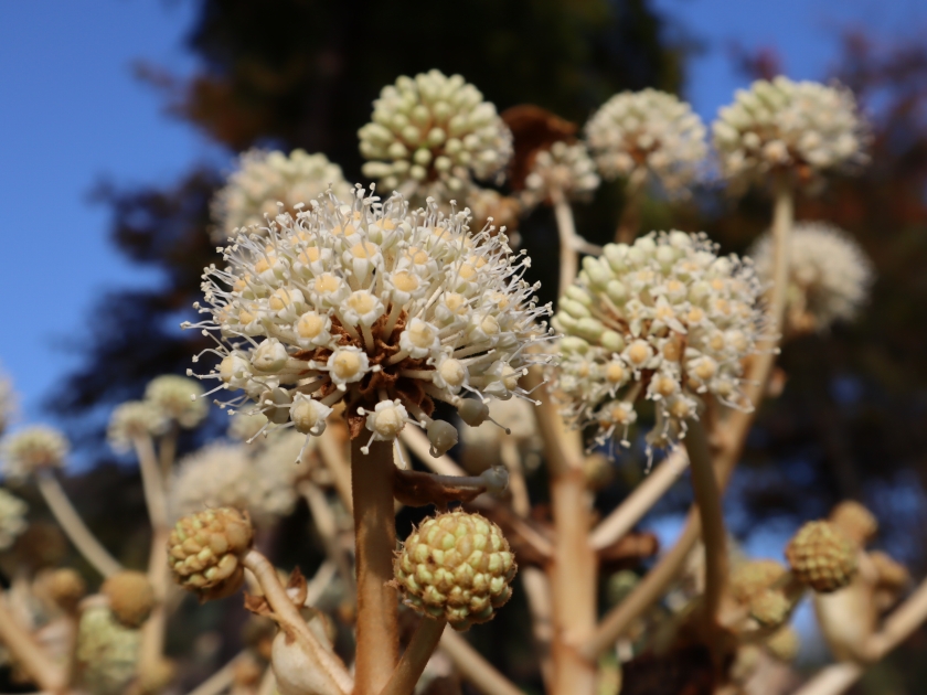 10人中9人がそばを通っても気づかないであろう、地味~なヤツデの花。お釈迦様の頭のようなツブツブの一つ一つが咲いています。人の目につかなくても、虫にはモテモテなんですよ!