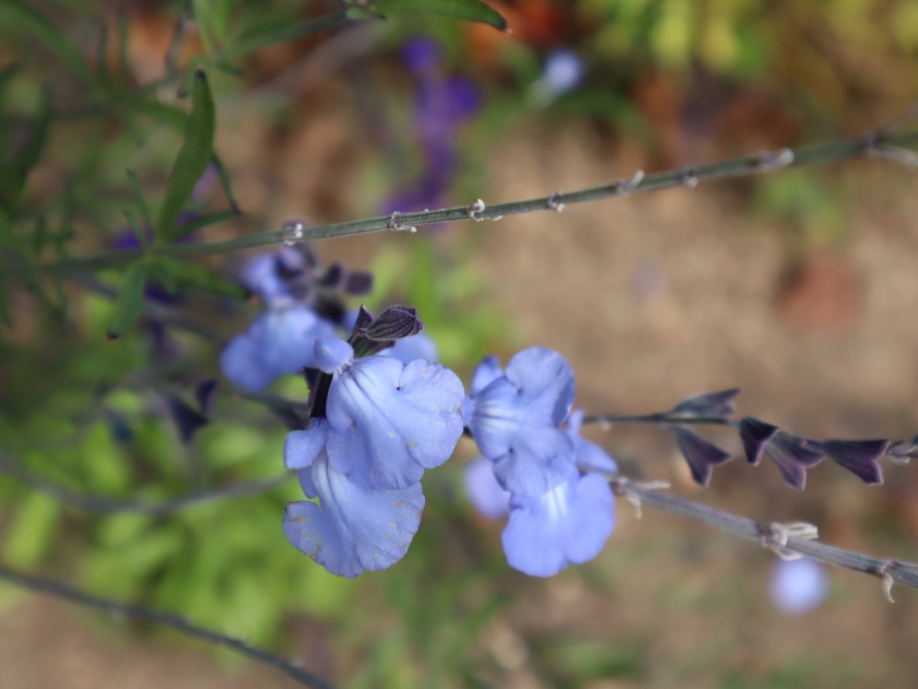 サルビアも終盤に向かってまいりました。紫色のサルビア・レウカンサ、ピンク色のサルビア・インボルクラータ、紺紫色のサルビア「インディゴスパイアー」、透明感のある水色のサルビア・アズレア。以上4種は全て多年草(宿根草)のサルビアです。