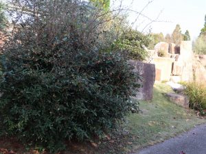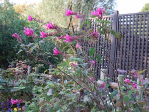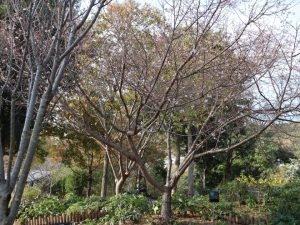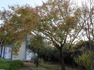 連絡口ゲートそば(半円形花壇前)の2本のナンキンハゼ、今年の紅葉はイマイチです。去年は片方赤く、もう一方が黄色くなってきれいだったのですが、微妙な色で落葉中。落葉後は白い実が枝に残ります。